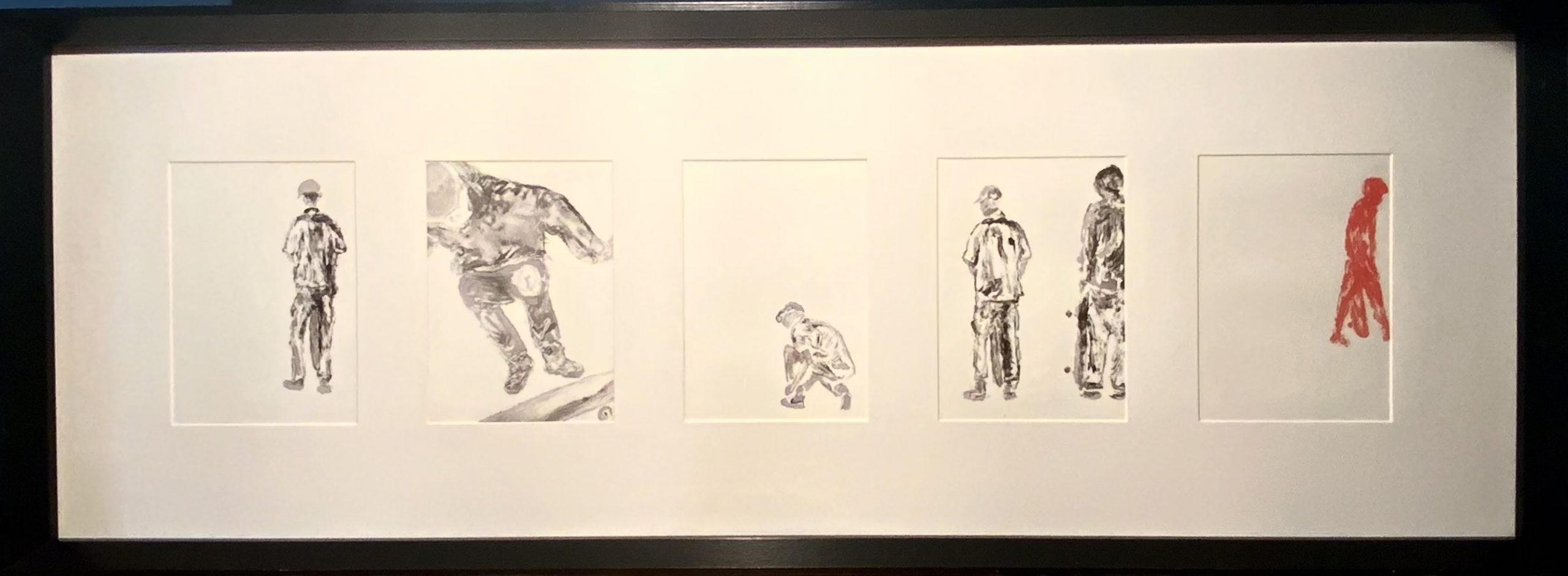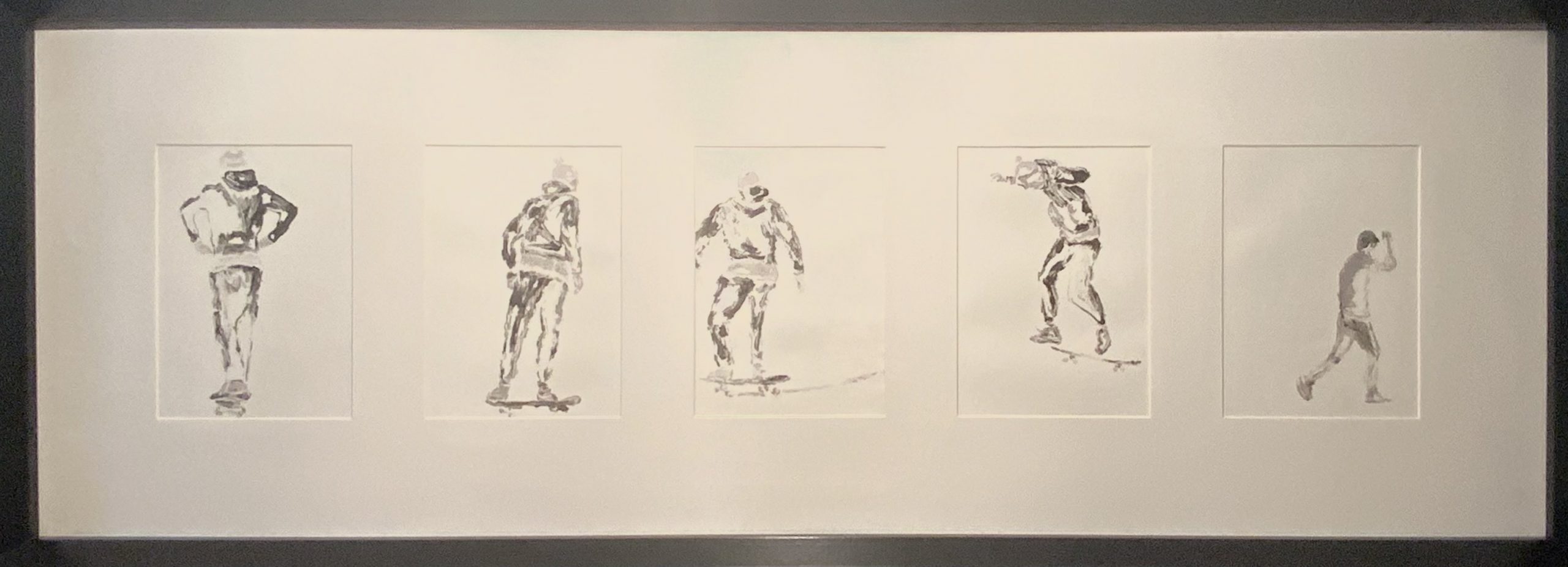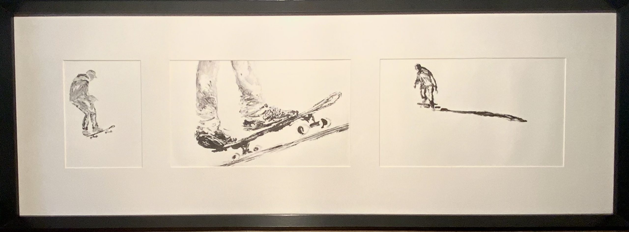 Le Skate LE SKATE Le Skatepark de la Manu de Châtellerault fait son cinéma. D’abord 3 exemples de la nombreuse série de monotypes puis un « montage » de monotypes dans 5 cadres, une suite de 5 séquences, 2020.